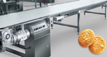 冷卻輸送機(jī)是餅干生產(chǎn)線的輔助設(shè)備,用于餅干烘烤后的冷卻輸送。能使餅干在呈柔軟狀態(tài)平穩(wěn)輸送,降低餅干溫度和使其水份蒸發(fā)與平衡。