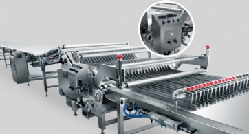該機(jī)是將冷卻后的餅干,通過(guò)星輪把餅干自動(dòng)堆成側(cè)立狀,再送至檢餅臺(tái)進(jìn)行包裝,能有效提高餅干包裝的工作效率。