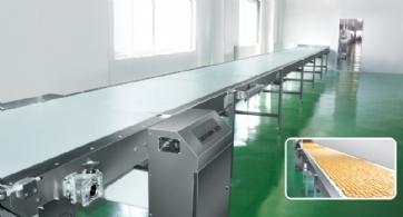 用于餅干烘烤后剝落,并與其它配套設(shè)備的過(guò)渡輸送。能使餅干在進(jìn)入噴油機(jī)前合理冷卻,又使部份餅干焦屑出爐篩落。