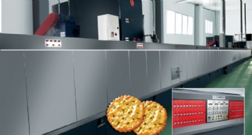 該爐由爐體、網(wǎng)帶傳動(dòng)系統(tǒng)、排潮系統(tǒng)、網(wǎng)帶糾偏系統(tǒng)、熱源及電控系統(tǒng)組成。適用餅干烘烤工藝的要求,能生產(chǎn)出各種合格的產(chǎn)品。