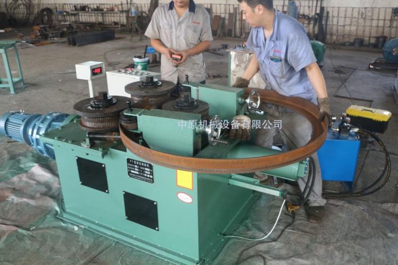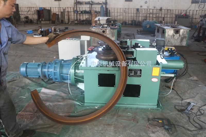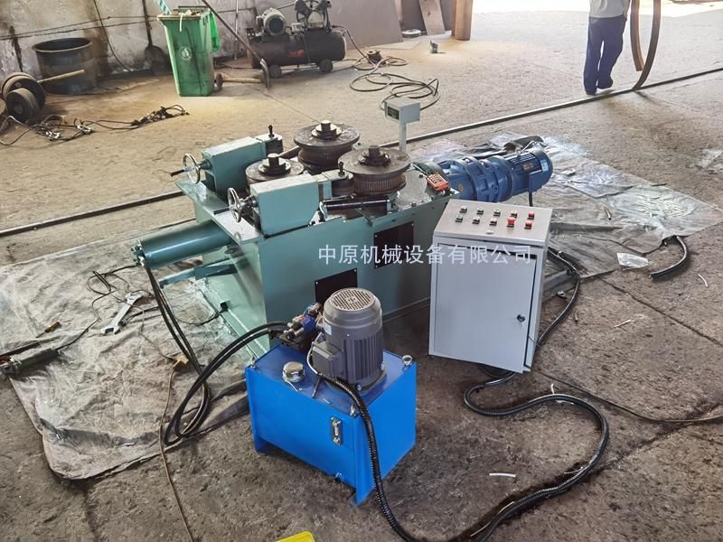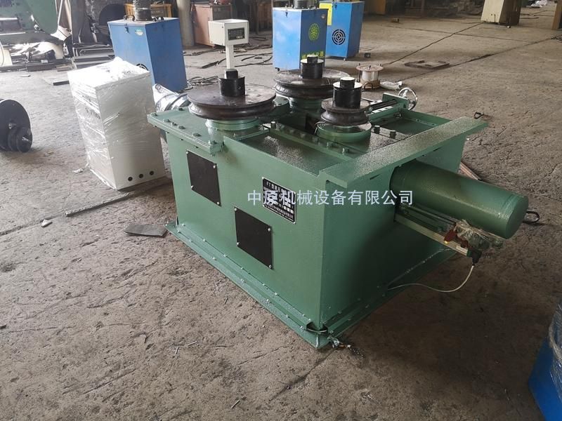 該機(jī)為叁輥型材卷圓機(jī),集機(jī)電一體。電機(jī)輸出的較高轉(zhuǎn)速通過(guò)傳動(dòng)裝置(聯(lián)軸器,減速機(jī),齒輪等)轉(zhuǎn)換成所需的大扭矩低轉(zhuǎn)速,帶動(dòng)固定位置的兩主動(dòng)輥實(shí)現(xiàn)旋轉(zhuǎn)運(yùn)動(dòng),為型材行走提供扭矩。被動(dòng)輥通過(guò)油缸前進(jìn)、后退實(shí)現(xiàn)位移,來(lái)控制直徑大小。三個(gè)工作輥成等腰三角形分布,通過(guò)調(diào)整移動(dòng)輥實(shí)現(xiàn)這三個(gè)點(diǎn)形成的弧線達(dá)到所需彎曲半徑,借助被動(dòng)輥的壓緊及兩主動(dòng)輥的旋轉(zhuǎn)運(yùn)動(dòng),使型材經(jīng)過(guò)多次連續(xù)彎曲,產(chǎn)生永久性塑性變形,用于常溫狀態(tài)下將型材卷制成圓形,弧形等工件。