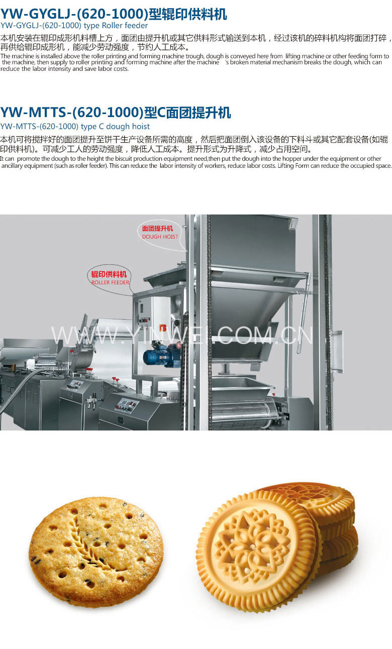 面團(tuán)提升機(jī)可將攪拌好的面團(tuán)提升至餅干生產(chǎn)設(shè)備所需的高度,然后把面團(tuán)倒入該設(shè)備的下料斗或其它配套設(shè)備(如輥印供料機(jī))?蓽p少工人的勞動(dòng)強(qiáng)度,降低人工成本。提升形式為升降式,減少占用空間。